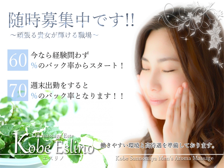 神戸三ノ宮に新規オープンにつきセラピストさん大募集!本格アロマオイルを使用した非風俗メンズエステ求人高収入アルバイトをお探しならキレイなお部屋でゆっくり個別で待機が出来る当店に是非お越し下さいませ。未経験の方でも簡単に出来るお仕事内容となっており、専属の女性トレーナーが解りやすく丁寧に指導させ頂きますのでご安心下さい。